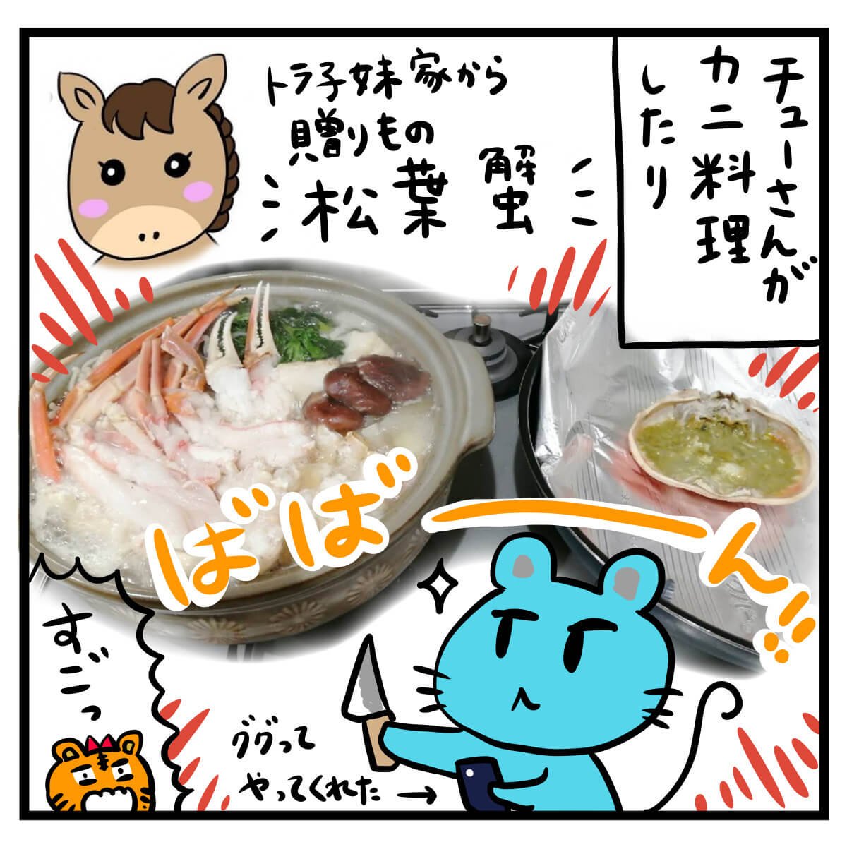 チューさんがトラ子妹から届いたカニをさばいてカニ鍋を食べたり。